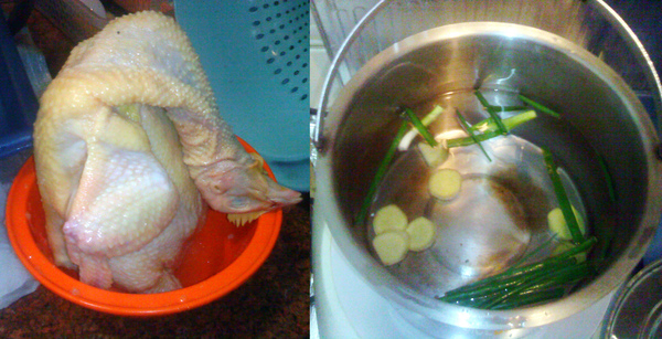 薑蔥水燒開了後, 把雞放進去煲5 分鐘, 然後取出來沖冷水; 這個部步驟我重複了三次, 第一次是開著爐去煮, 其餘兩次就是水開了, 放雞下去, 等它燒開就關爐等一次5 分鐘, 最後一次10-15 分鐘; 而最後一次就沒有用冷水沖... :p